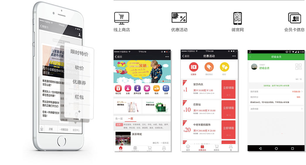 公众号菜单配置:线上商店、优惠活动、微官网、会员卡信息等。